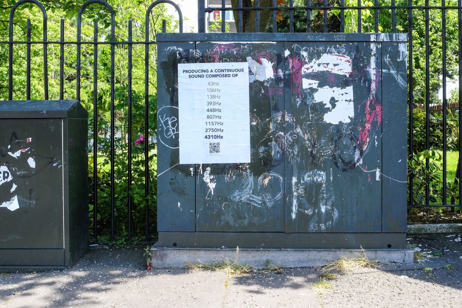 The box is on a footpath on Ardmoulin Street, behind a small fenced-off green area, close to Divis Street and in view of Divis Tower.